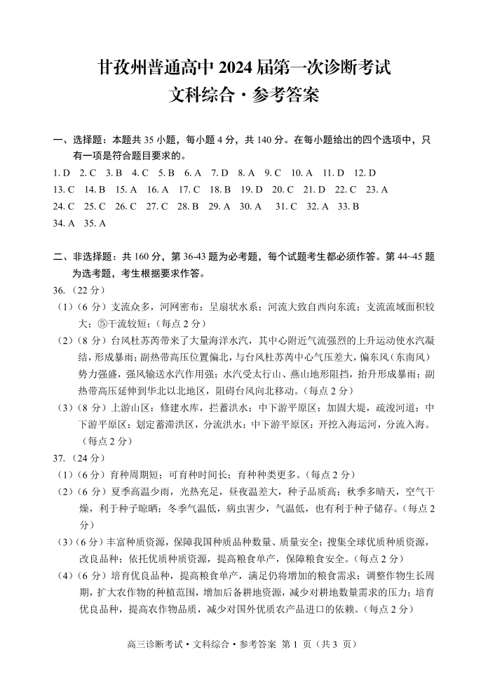 四川省甘孜州2024届高三上学期第一次诊断考试文综答案
