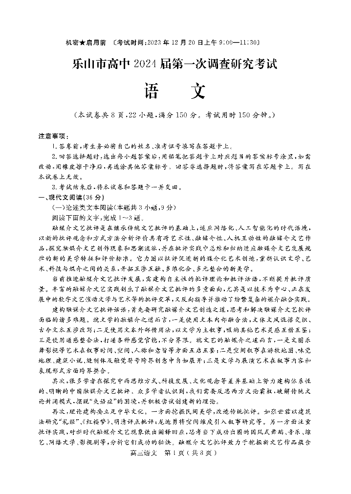四川省乐山市2024届高三上学期第一次调研考试语文