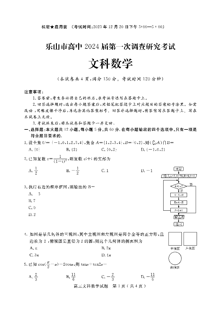 四川省乐山市2024届高三上学期第一次调研考试文科数学