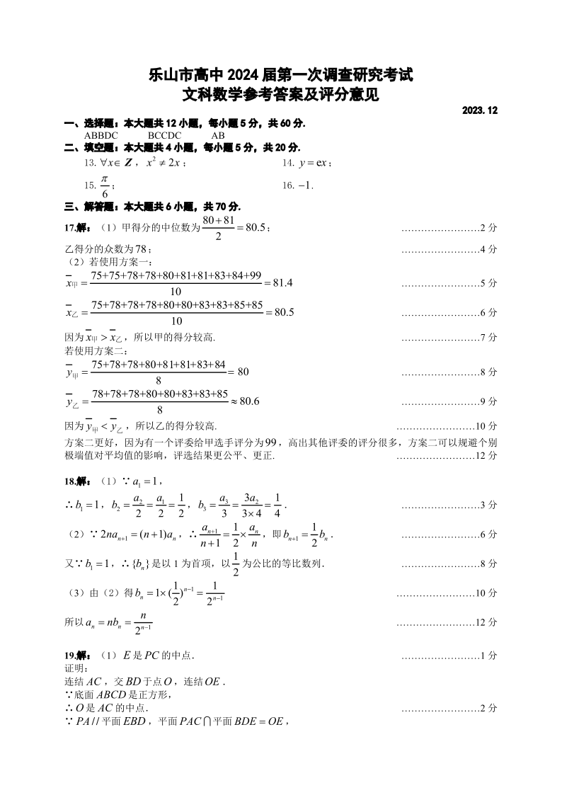 四川省乐山市2024届高三上学期第一次调研考试文科数学答案