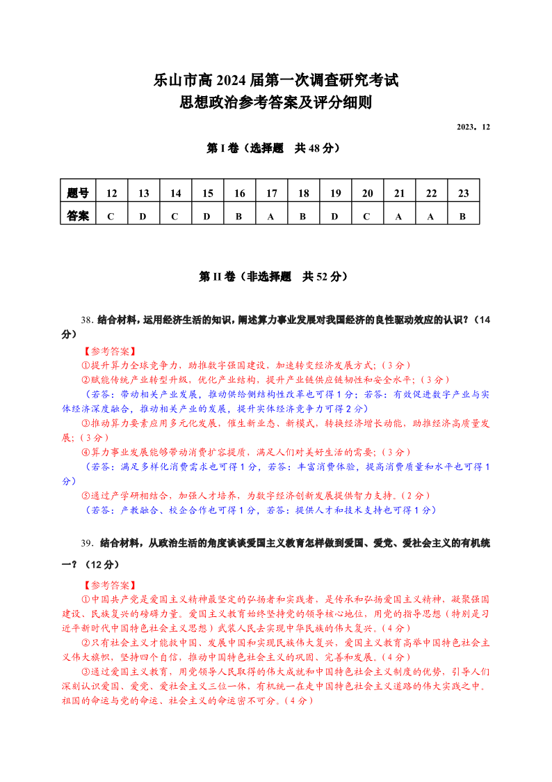 四川省乐山市2024届高三上学期第一次调研考试文综政治答案