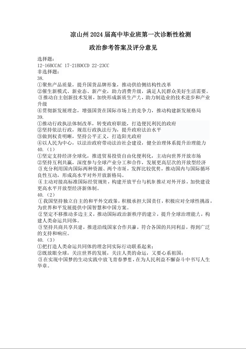 四川省凉山彝族自治州2024届高三第一次诊断性检政治答案
