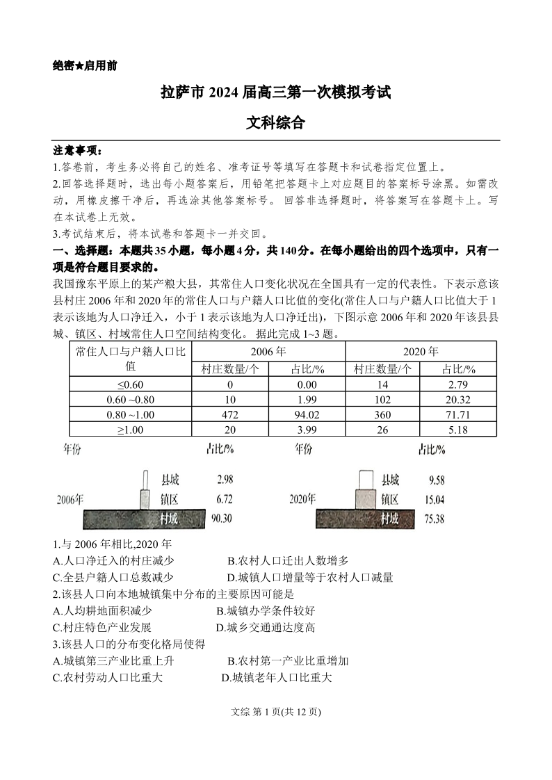 西藏自治区拉萨市2024届上学期第一次模拟考试文综