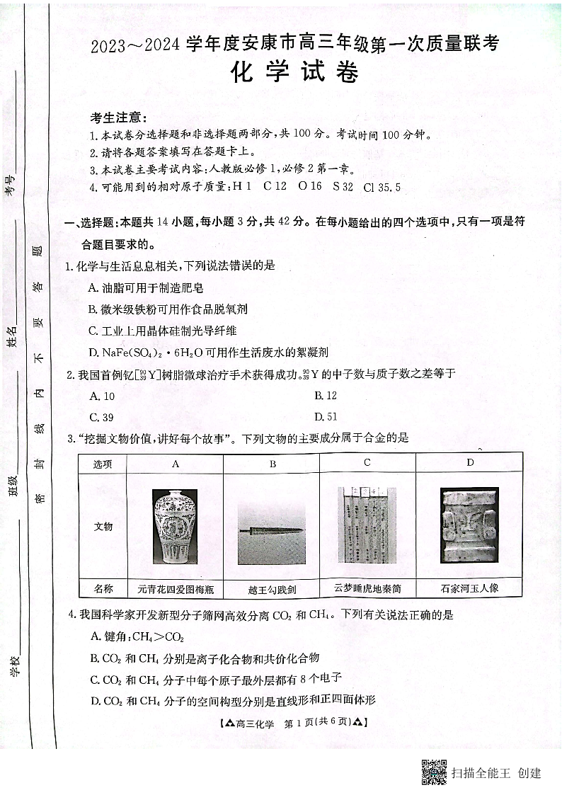 陕西省安康市2024届高三上学期11月期中考试化学