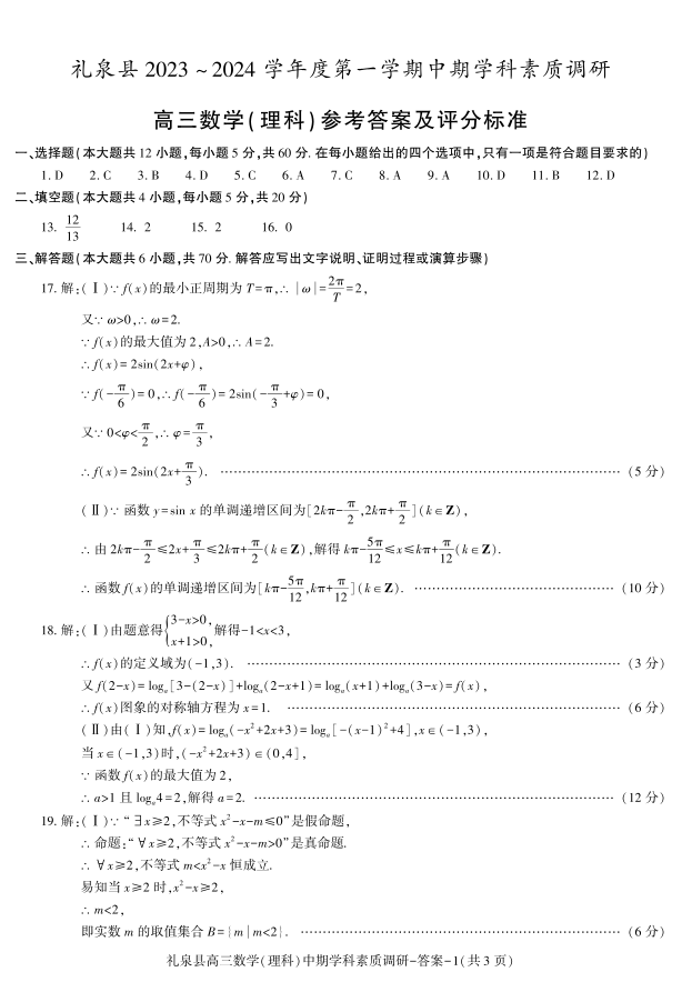 陕西省咸阳市礼泉县2024届高三第一学期中期学科素质调研理科数学答案