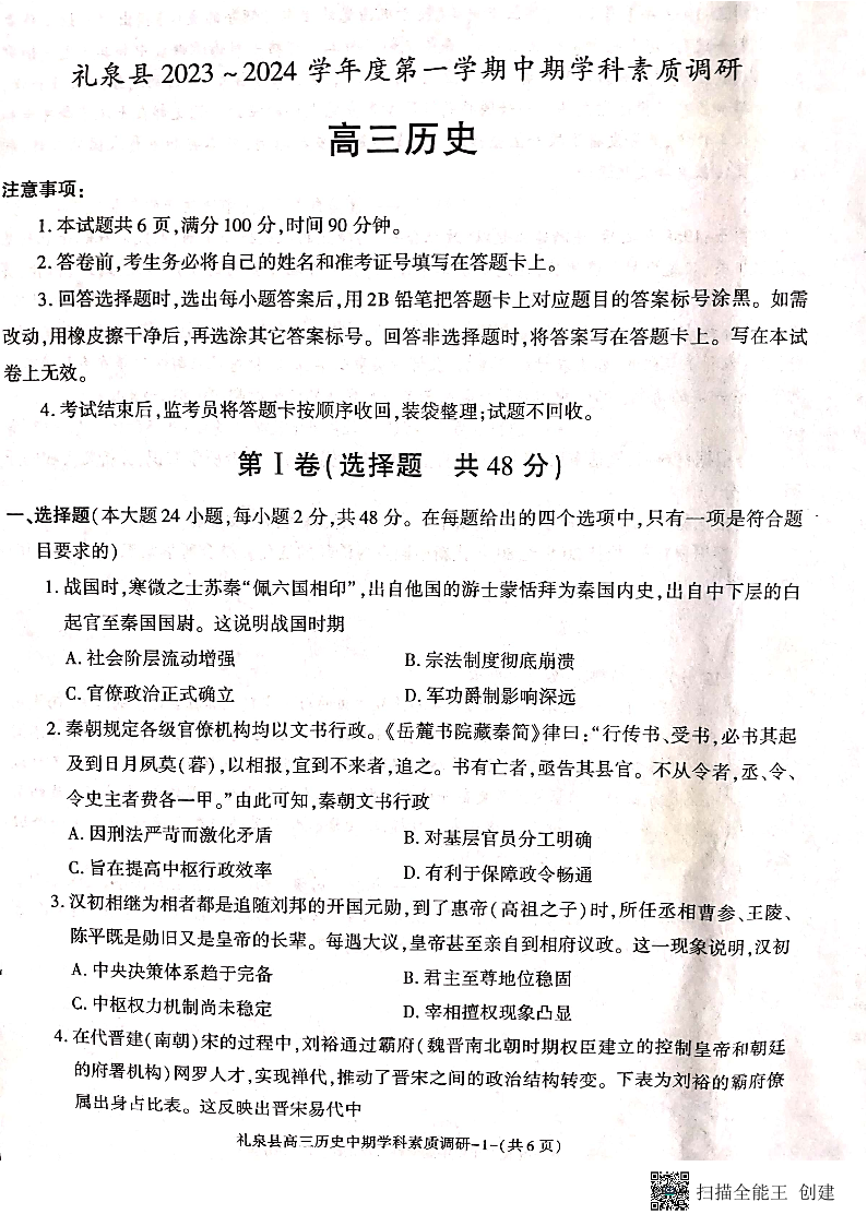 陕西省咸阳市礼泉县2024届高三第一学期中期学科素质调研历史