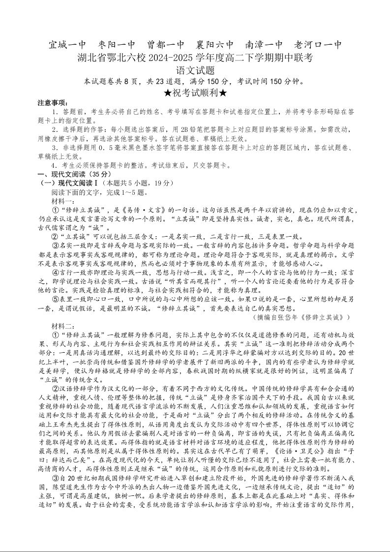 湖北省鄂北六校2024-2025学年下学期高二期中联考语文+答案