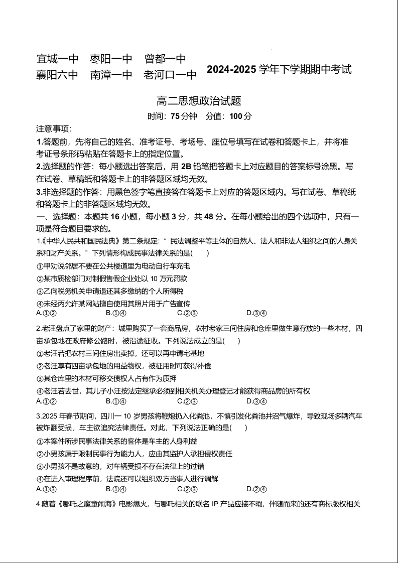 湖北省鄂北六校2024-2025学年下学期高二期中联考政治+答案