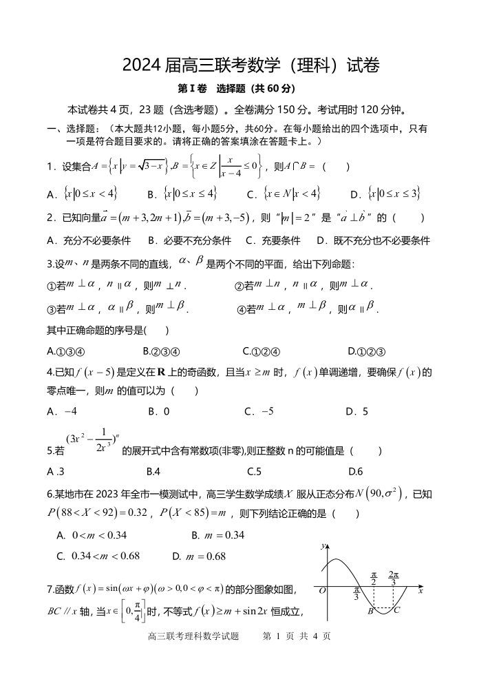陕西省宝鸡实验高级中学2024届高三上学期12月联考 理数