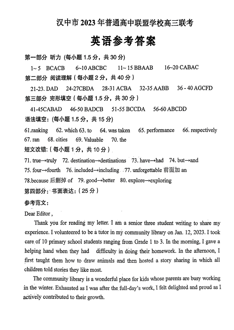 陕西省汉中市普通高中联盟2024届高三上学期期中联考英语答案