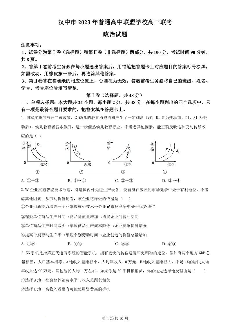 陕西省汉中市普通高中联盟2024届高三上学期期中联考政治(原卷版)