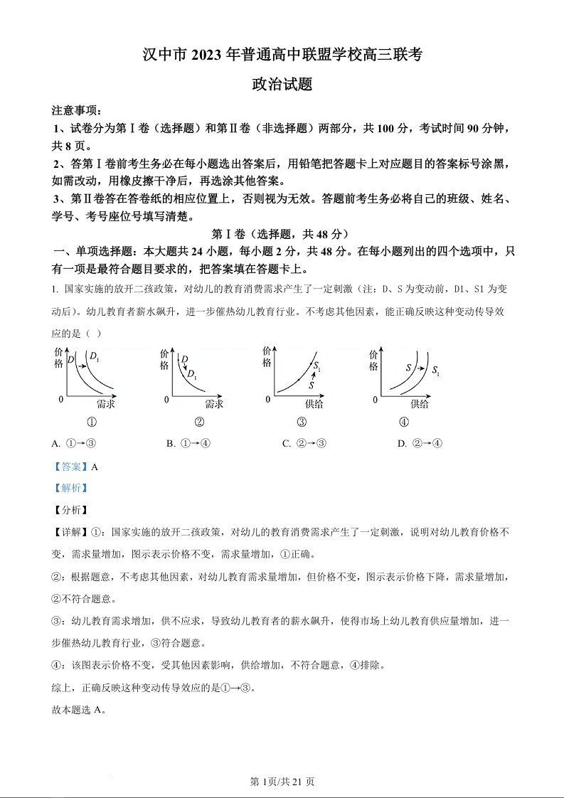 陕西省汉中市普通高中联盟2024届高三上学期期中联考政治(精品解析版)