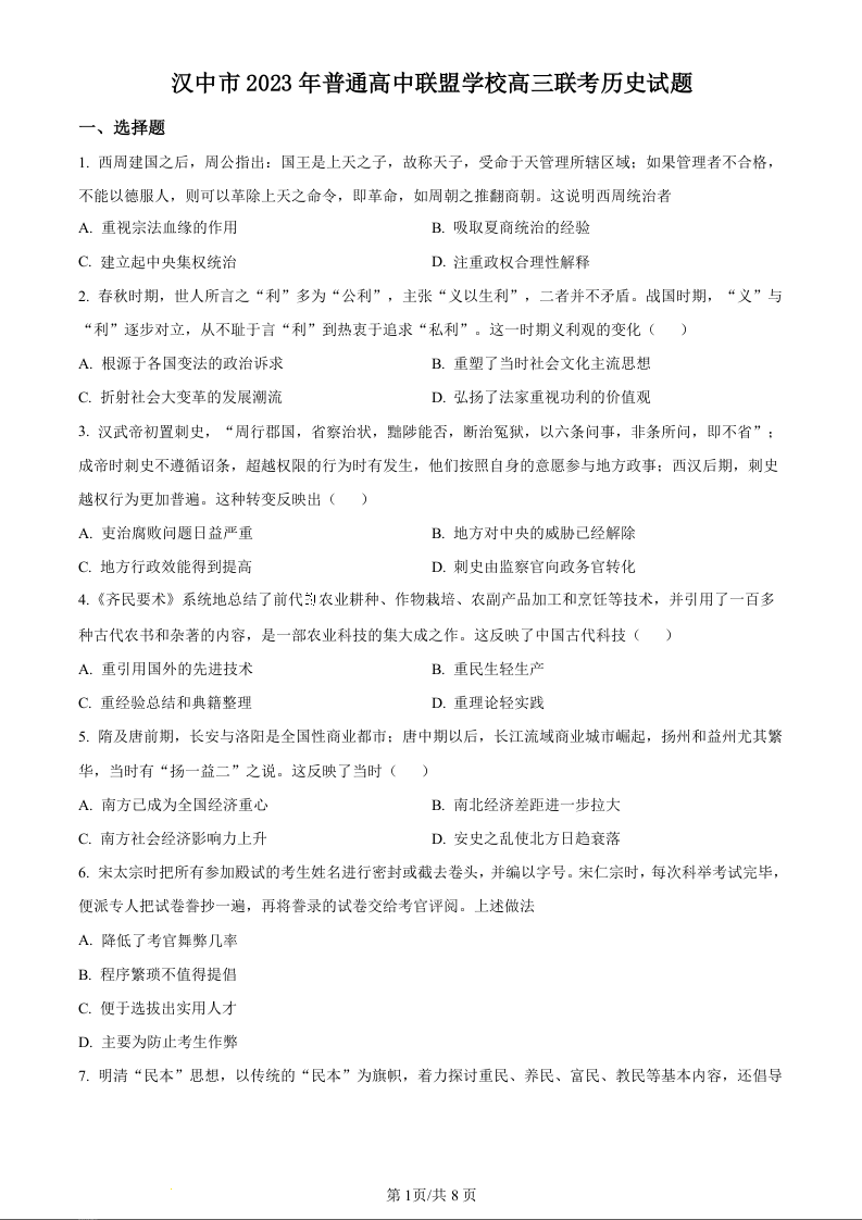 陕西省汉中市普通高中联盟2024届高三上学期期中联考历史(原卷版)