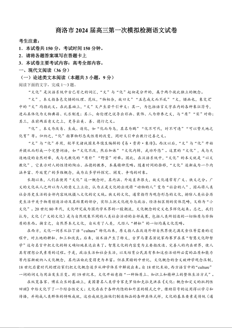 陕西省商洛市2024届高三上学期第一次模拟检测语文含答案