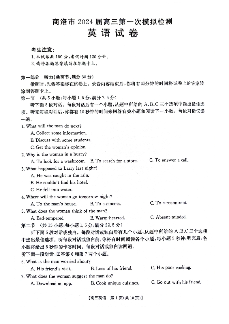 陕西省商洛市2024届高三上学期第一次模拟检测英语