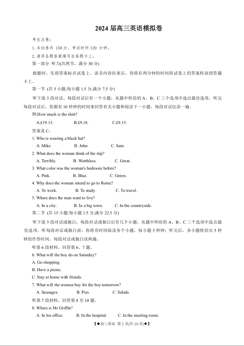 陕西省西安市长安区教育片区2024届高三上学期模拟考试英语