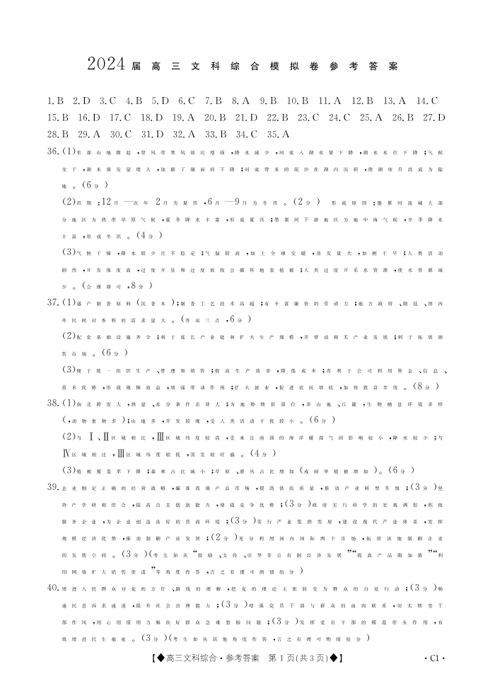陕西省西安市长安区教育片区2024届高三上学期模拟考试文科综合答案