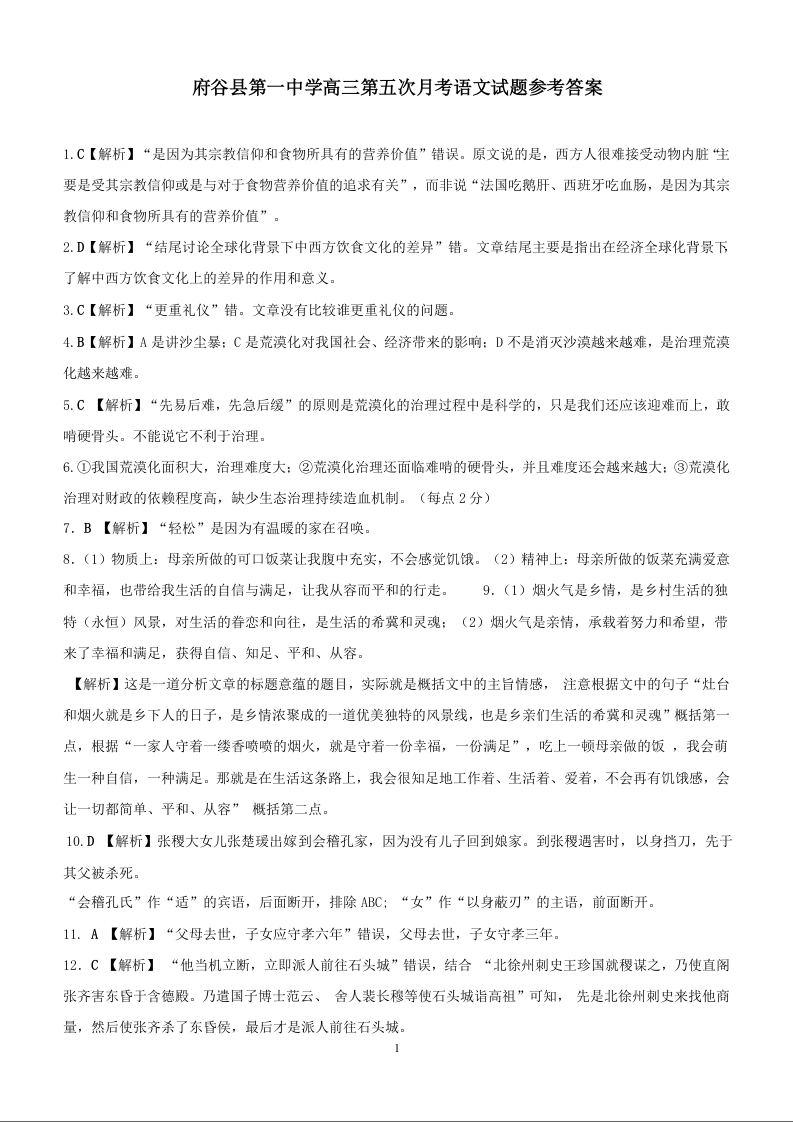 陕西省榆林市府谷县第一中学2023-2024学年高三上学期12月月考 语文答案
