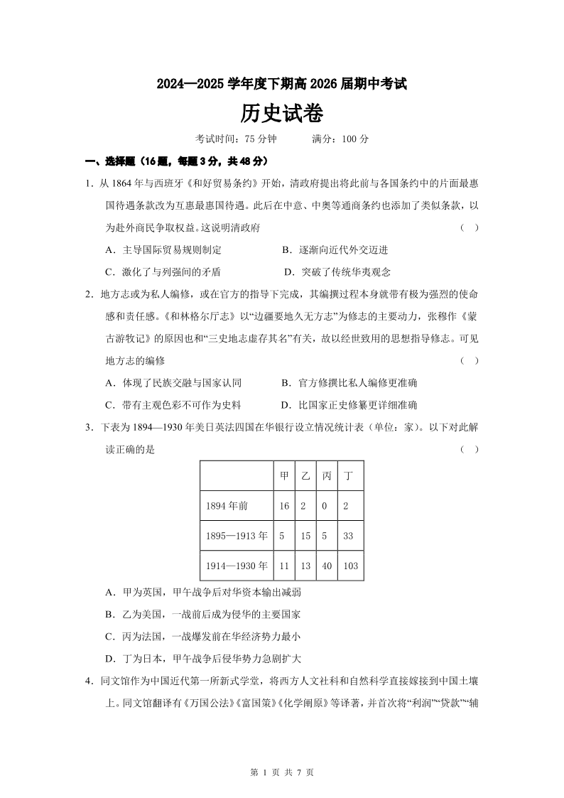 四川省成都市第七中学2024-2025学年下期高二半期考试历史