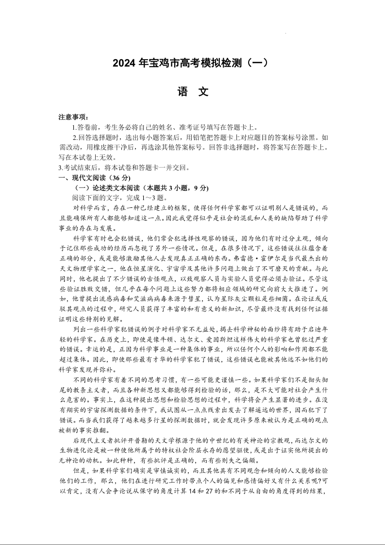 陕西省宝鸡市2023-2024学年高三上学期高考模拟检测(一)语文