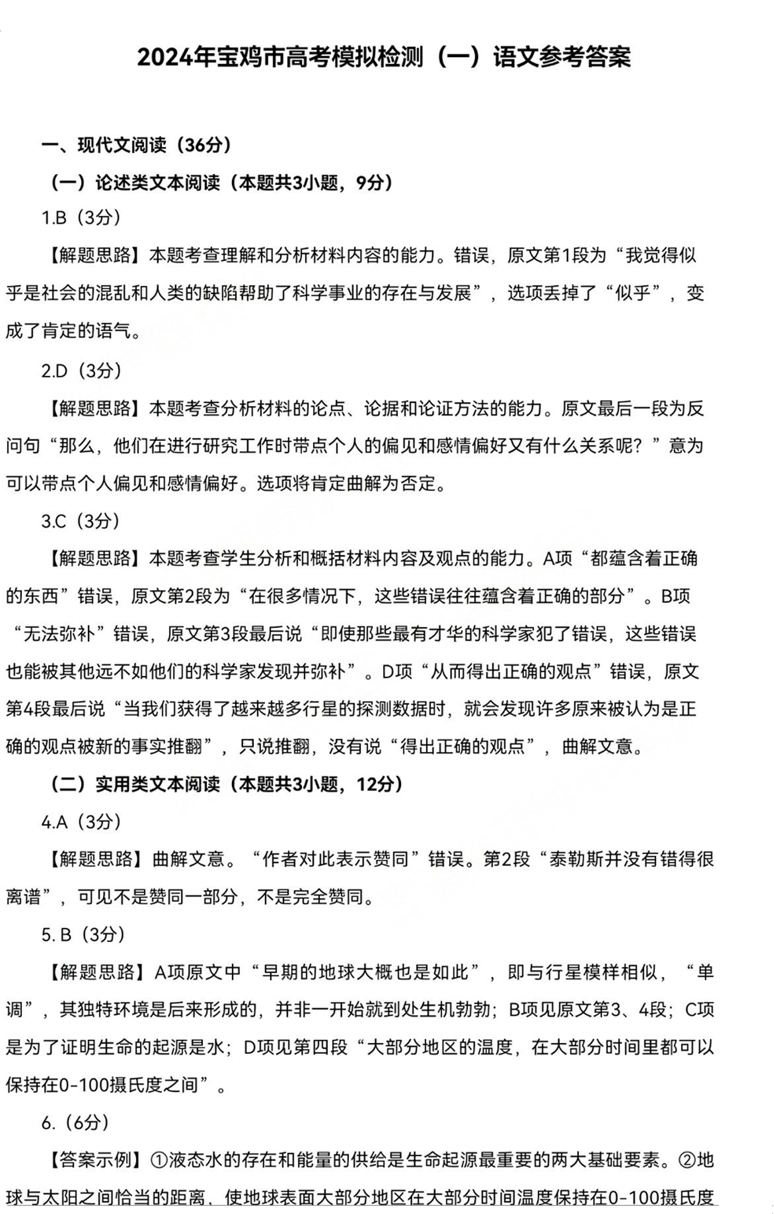 陕西省宝鸡市2023-2024学年高三上学期高考模拟检测(一)语文答案