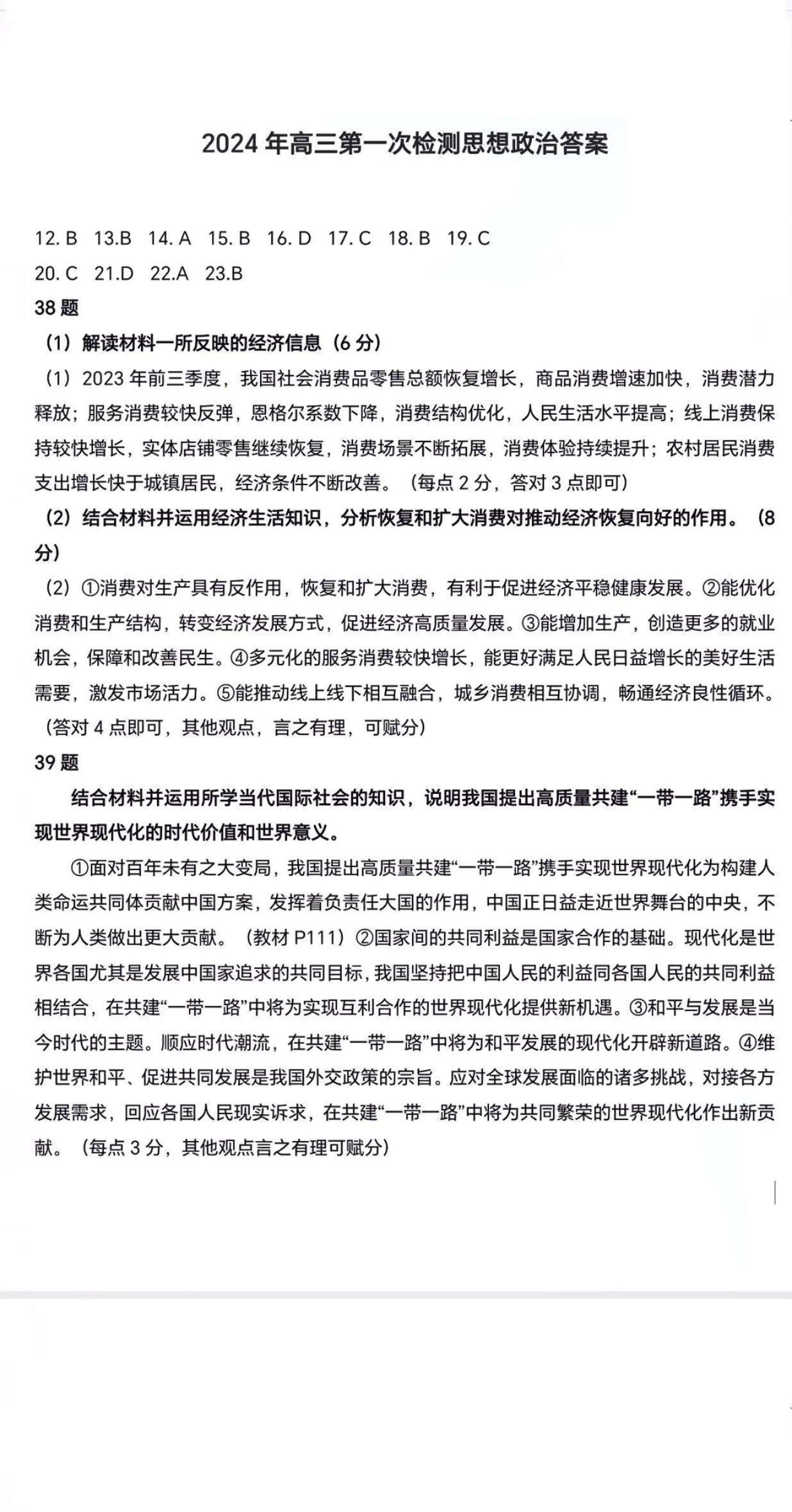 陕西省宝鸡市2024届高三上学期高考模拟检测(一)文综答案