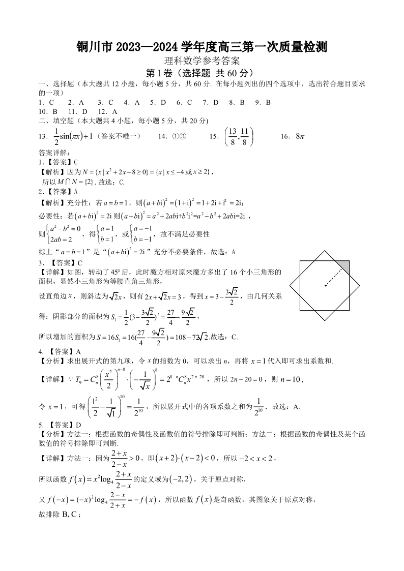 铜川市2023—2024学年度高三第一次模拟考试 理数答案