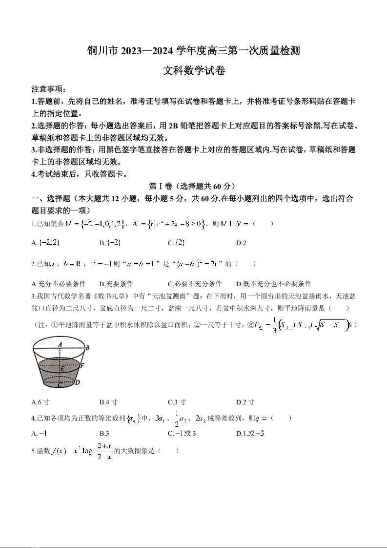 陕西省铜川市2024届高三上学期第一次模拟考试文科数学