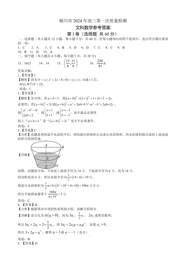 铜川市2023—2024学年度高三第一次模拟考试 文数答案