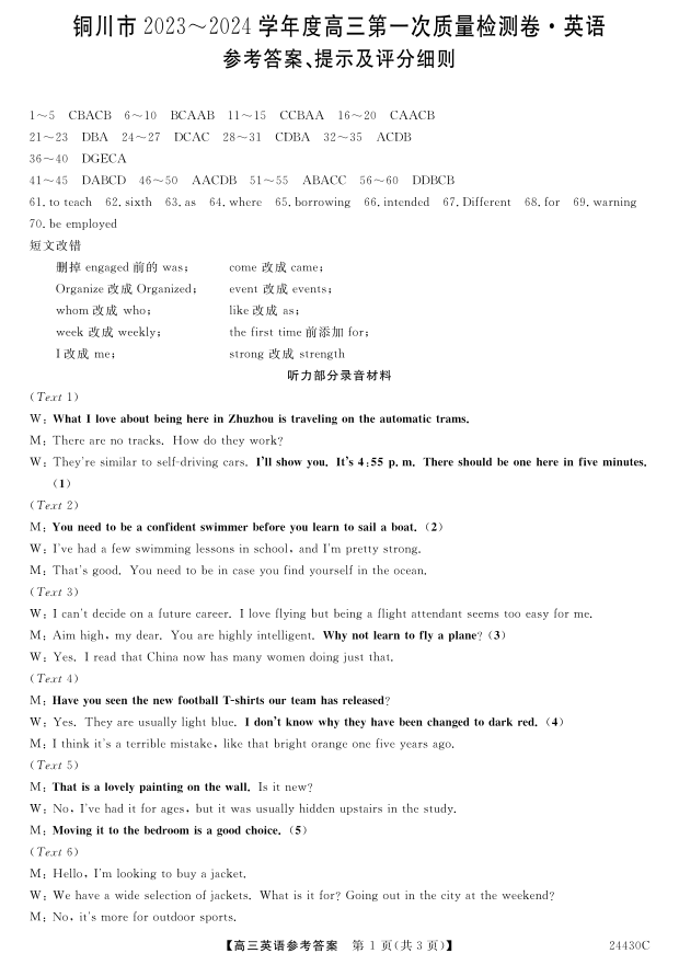 铜川市2023—2024学年度高三第一次模拟考试 英语答案
