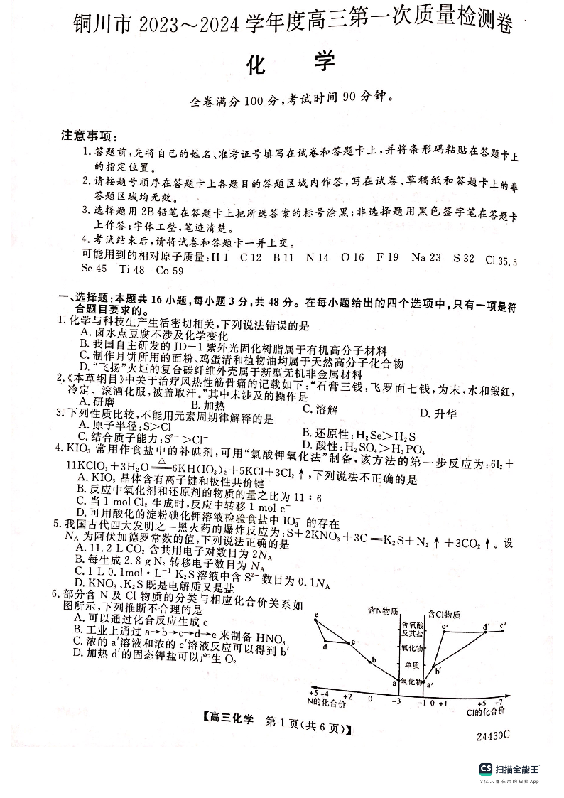 铜川市2023—2024学年度高三第一次模拟考试 化学