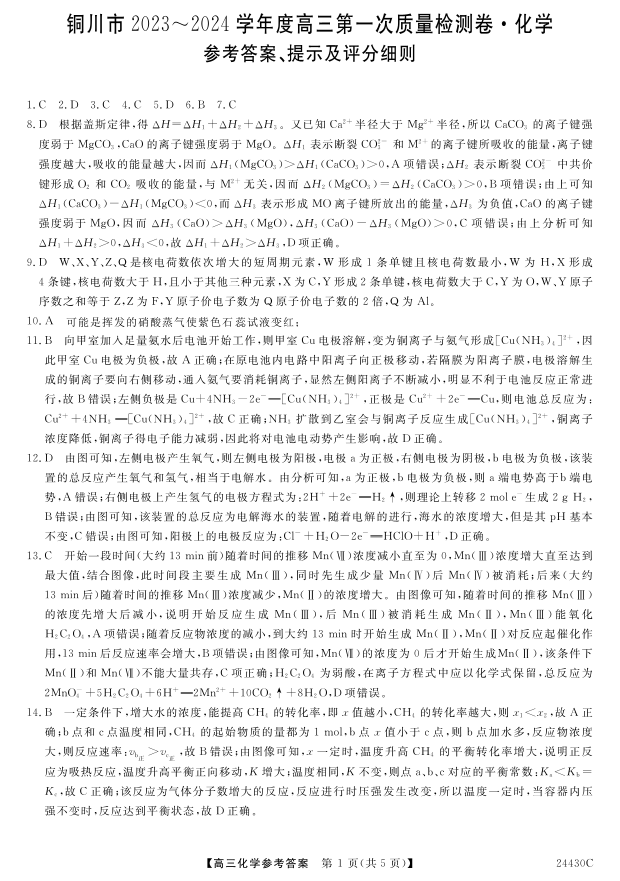 铜川市2023—2024学年度高三第一次模拟考试 化学答案