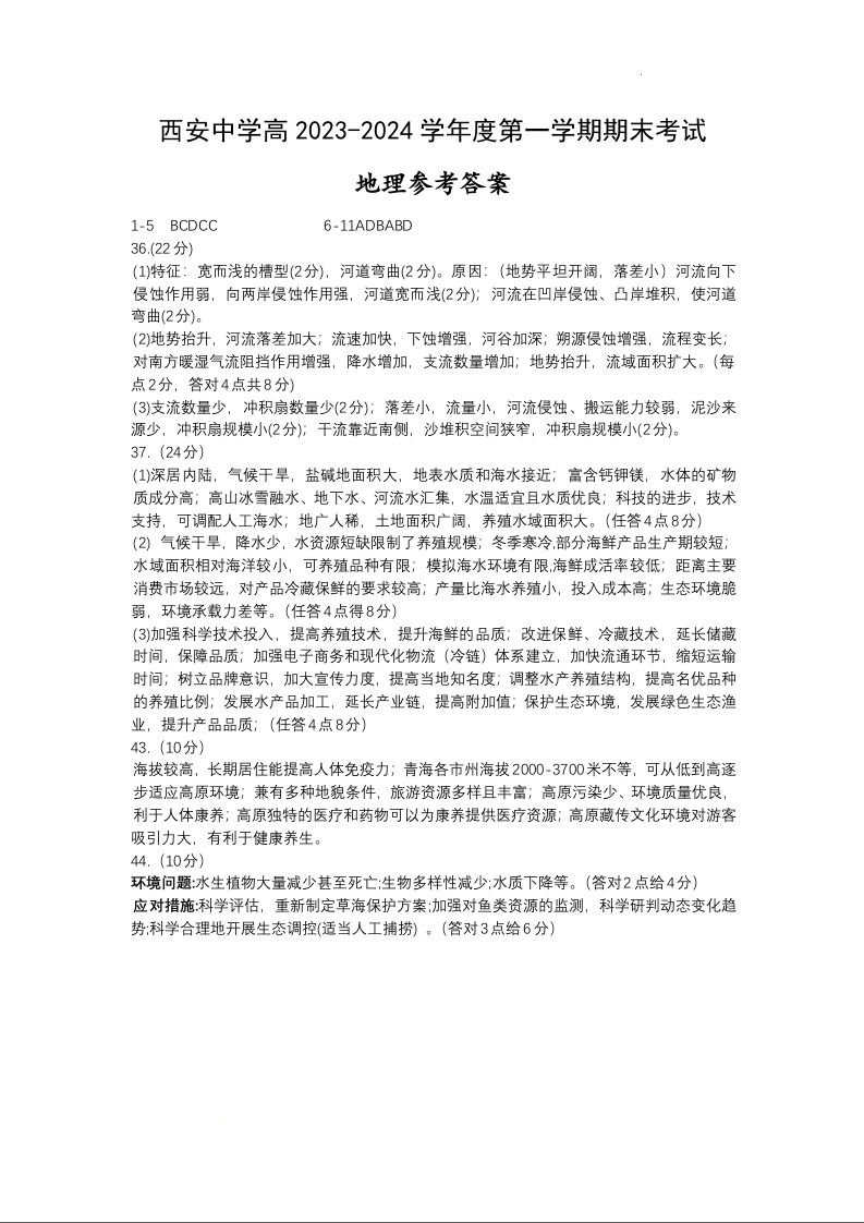 陕西省西安中学2024届高三上学期期末考试地理答案