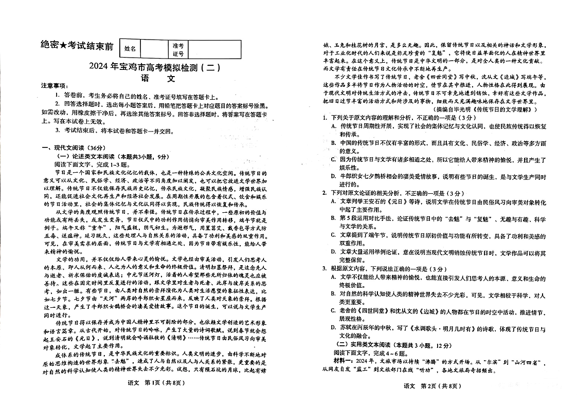 陕西省宝鸡市2024届高三下学期高考模拟检测(二)语文