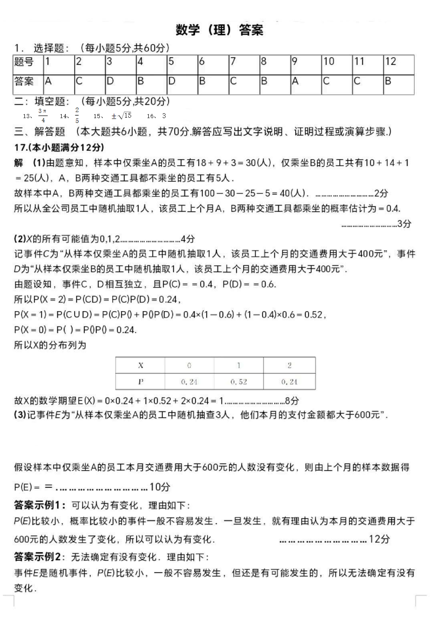 陕西省宝鸡市2024届高三下学期高考模拟检测(二)理科数学答案