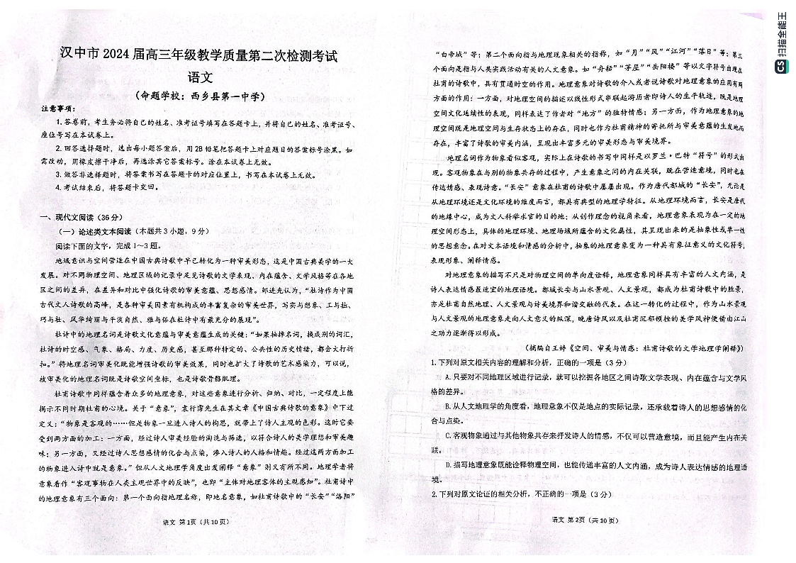 陕西省汉中市2024届高三下学期第二次检测(二模)语文