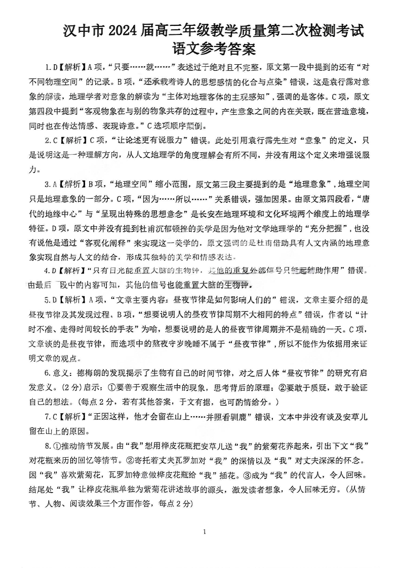 陕西省汉中市2024届高三下学期第二次检测(二模)语文答案