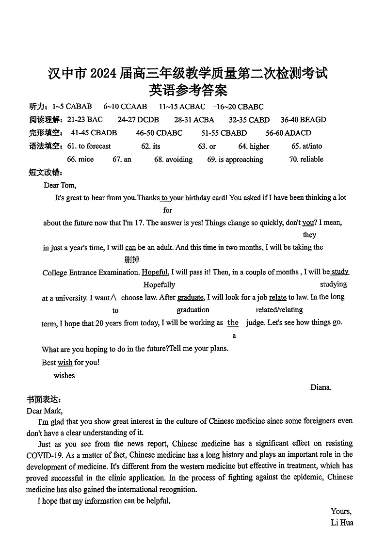 陕西省汉中市2024届高三下学期第二次检测(二模)英语答案
