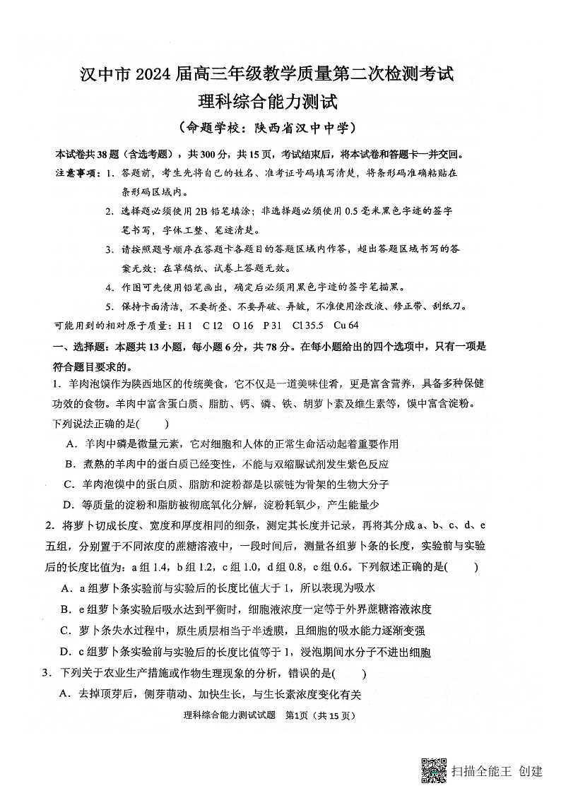 陕西省汉中市2024届高三下学期第二次检测(二模)理科综合