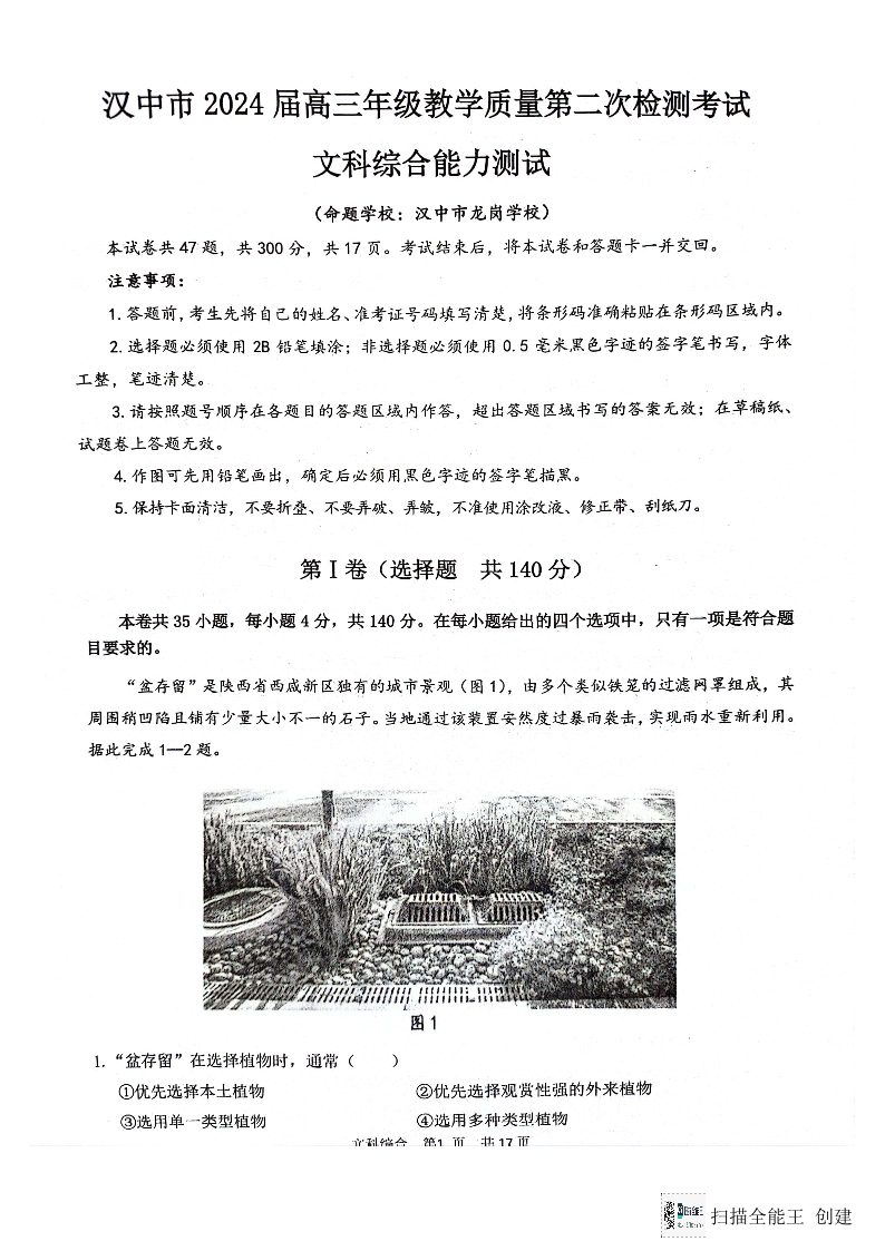 陕西省汉中市2024届高三下学期第二次检测(二模)文科综合