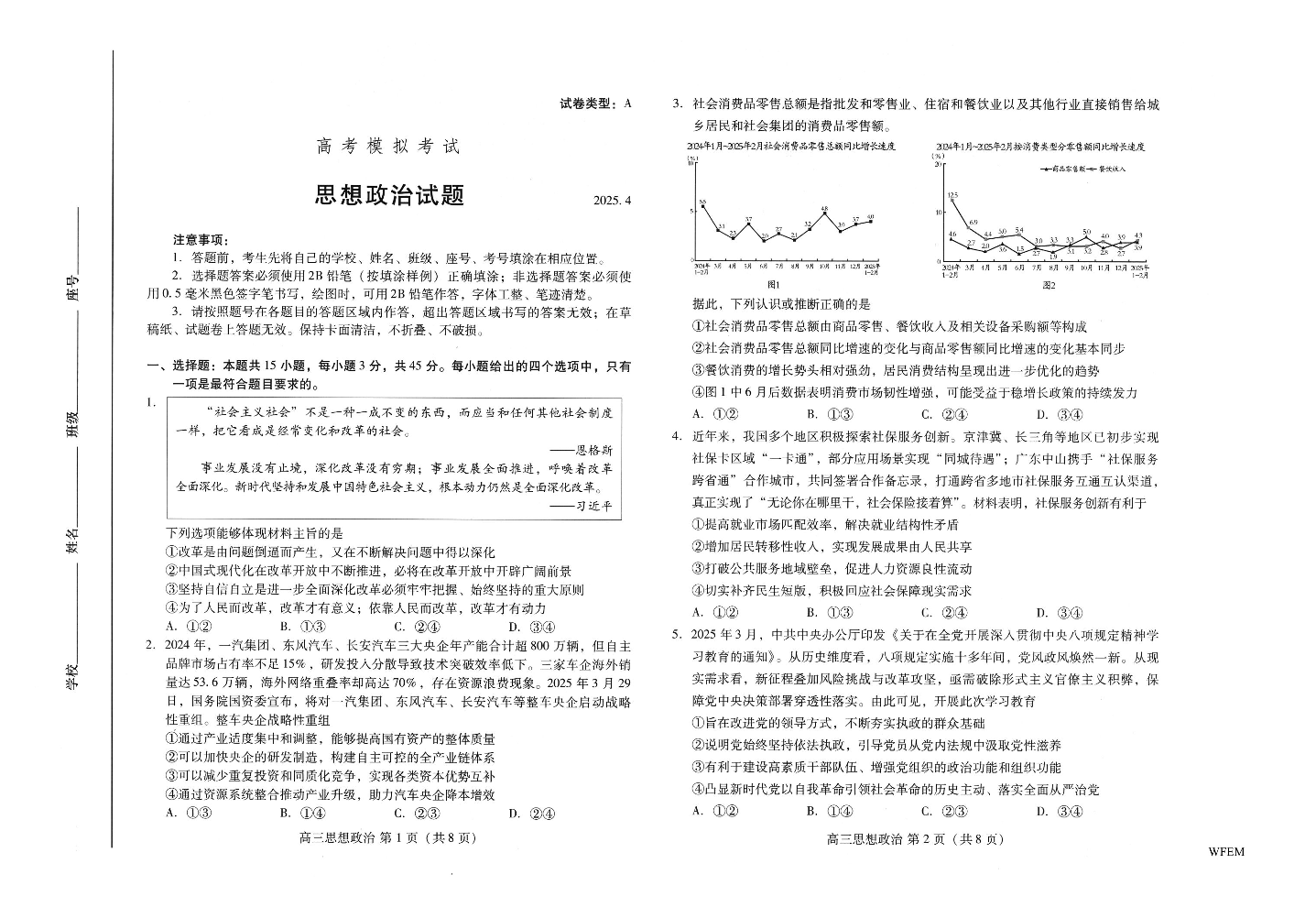 山东省潍坊市2024-2025学年下学期4月高三高考二模统考政治