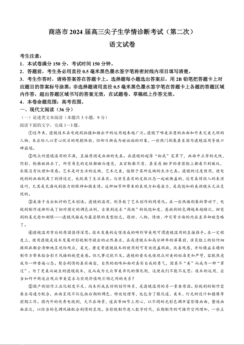 陕西省商洛市尖子生2024届高三尖子生学情诊断考试(第二次)语文含答案