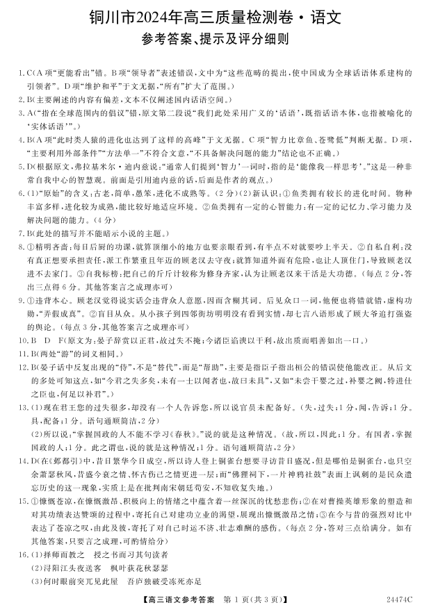 陕西省铜川市2024届高三下学期第二次模拟考试语文答案
