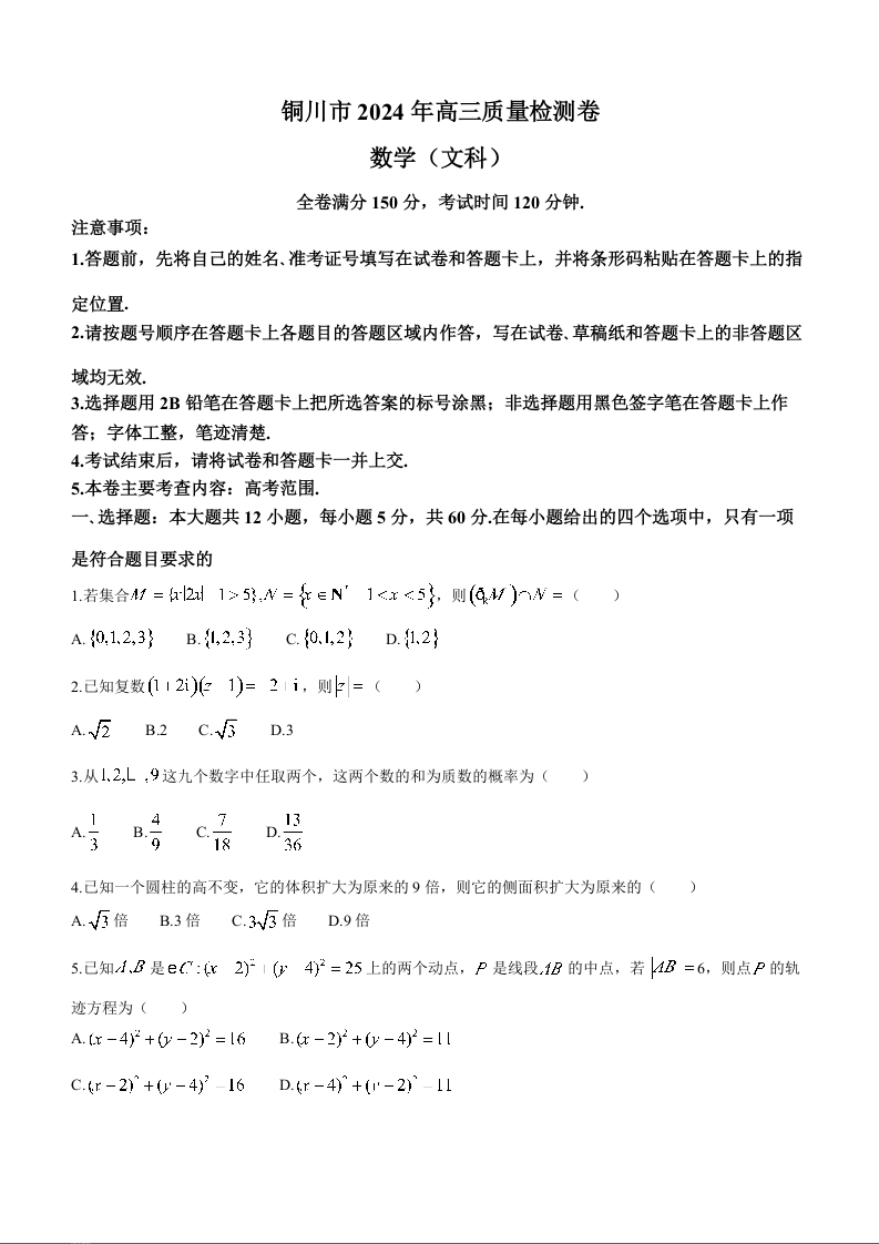 陕西省铜川市2024届高三下学期第二次模拟考试文科数学含答案