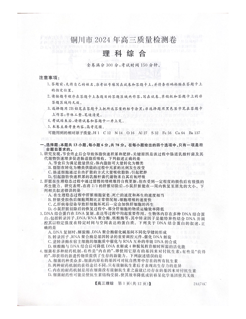 陕西省铜川市2024届高三下学期第二次模拟考试理科综合