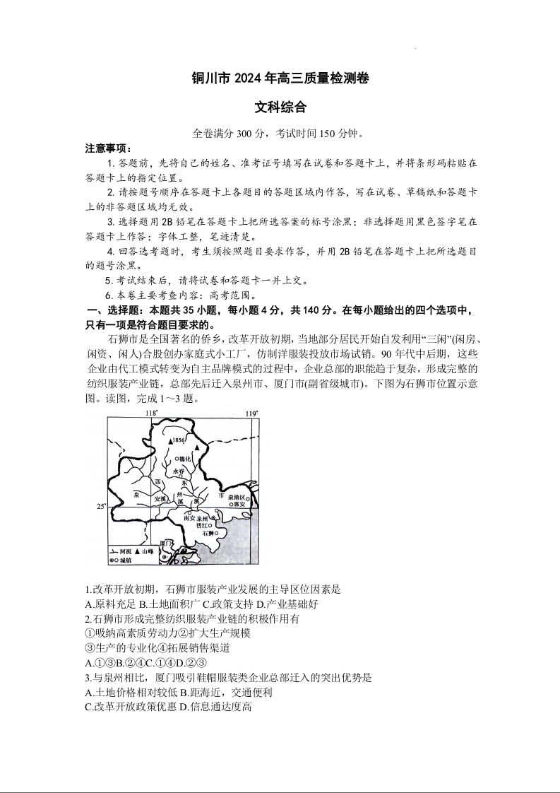 陕西省铜川市2024届高三下学期第二次模拟考试文科综合含答案