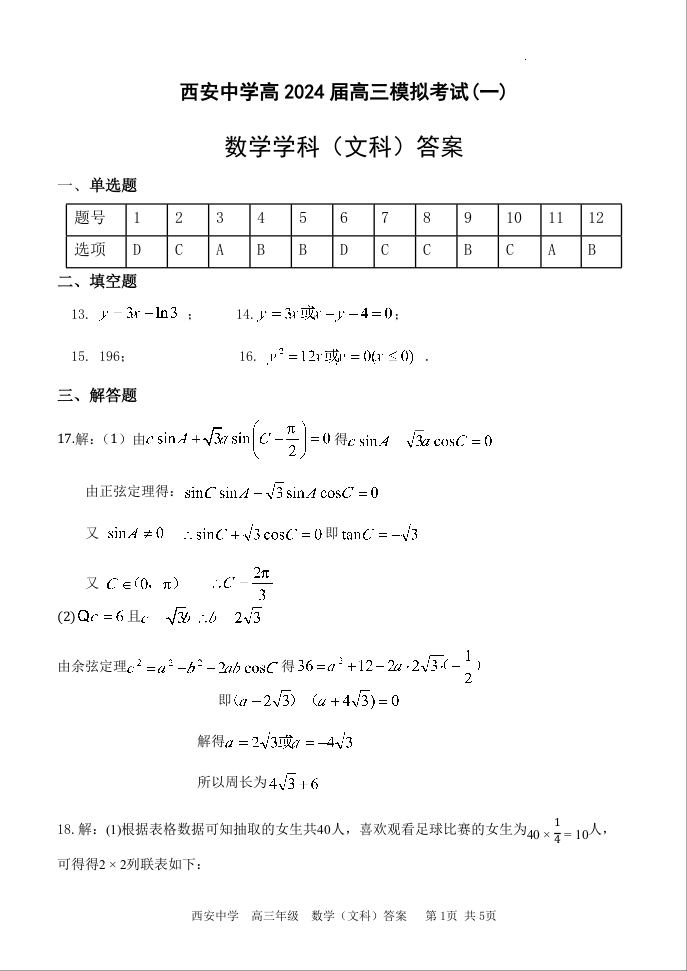 陕西省西安中学2024届高三模拟考试(一)文科数学答案