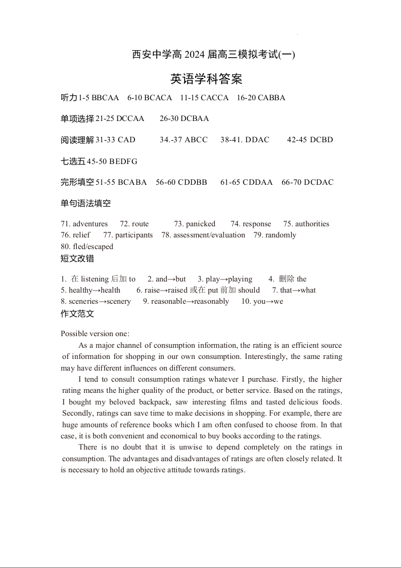 陕西省西安中学2024届高三模拟考试(一)英语答案