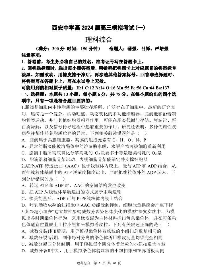 陕西省西安中学2024届高三模拟考试(一)理科综合