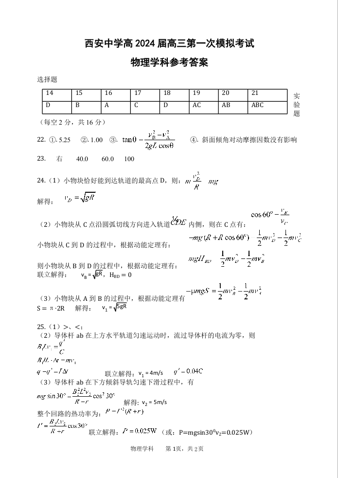 陕西省西安中学2024届高三模拟考试(一)物理答案